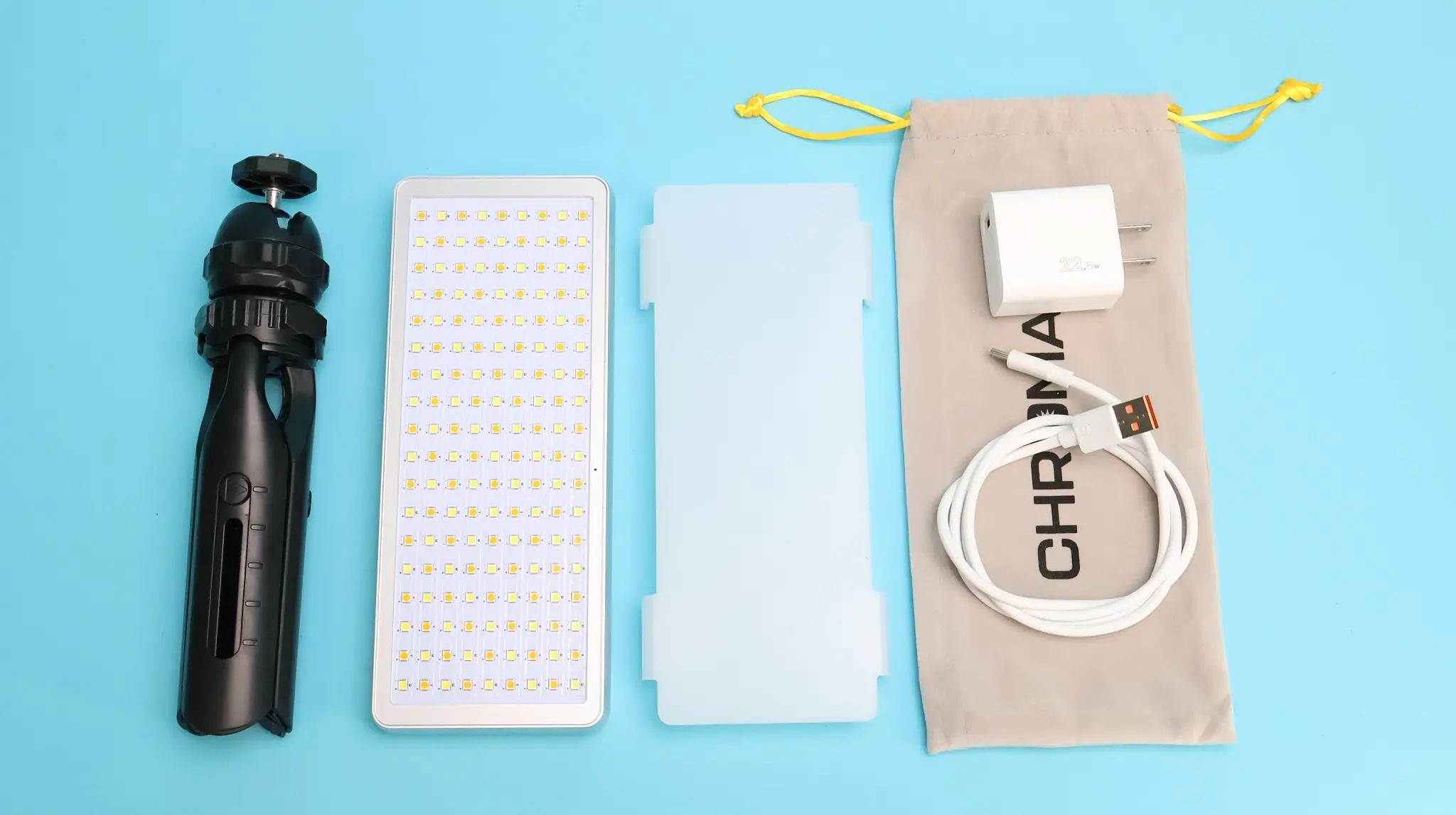 First off, in the box you get: The lamp, a diffuser, tripod, soft carry pouch, and a USB-C charging cable + transformer.