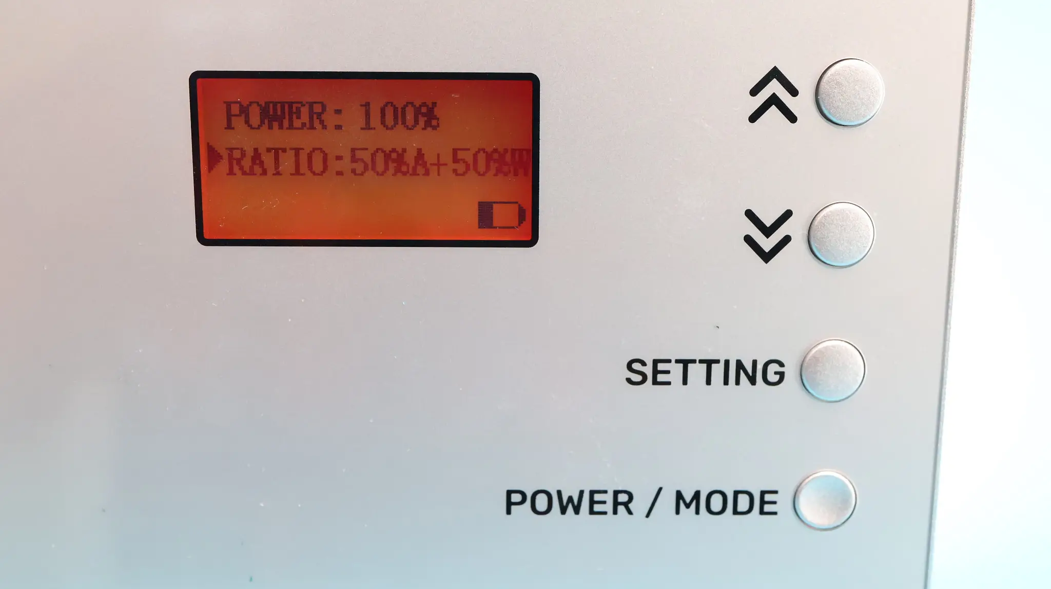 Press and hold the power button to turn it off and on, setting will select between the power (brightness) and ratio, while the arrows allow you to change those. The ratio is simply how much of the white or amber channel you want.